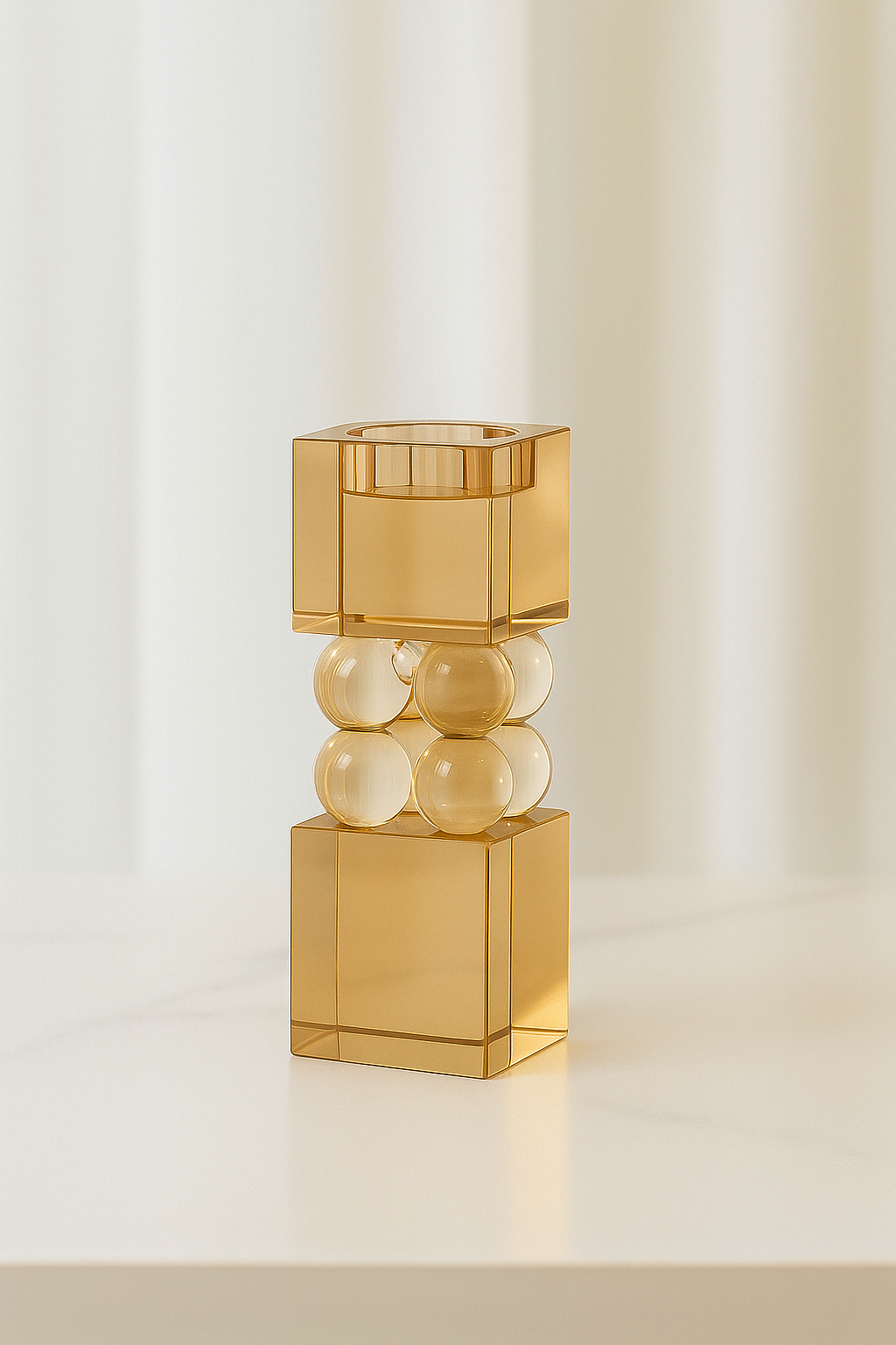 تحفة فنية متعددة الاستخدامات بتصميم هندسي عصري، مصنوعة من الكريستال الفاخر بتدرجات اللون الذهبي . يمكن استخدامها كمبخر عند وضعها بالوضع العمودي، بينما تتحول إلى شمعدان أنيق عند قلبها. تجمع بين الجمال والوظيفة، لتضيف لمسة فخمة لأي ركن في منزلك