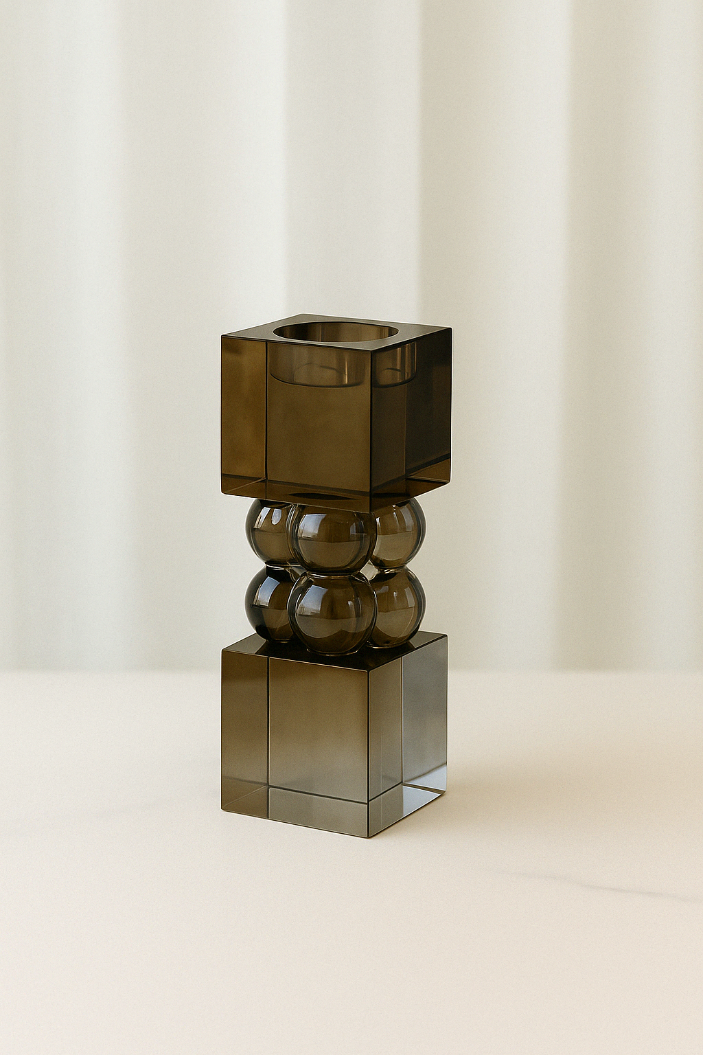 تحفة فنية متعددة الاستخدامات بتصميم هندسي عصري، مصنوعة من الكريستال الفاخر بتدرجات اللون الاسود الدخاني. يمكن استخدامها كمبخر عند وضعها بالوضع العمودي، بينما تتحول إلى شمعدان أنيق عند قلبها. تجمع بين الجمال والوظيفة، لتضيف لمسة فخمة لأي ركن في منزلك